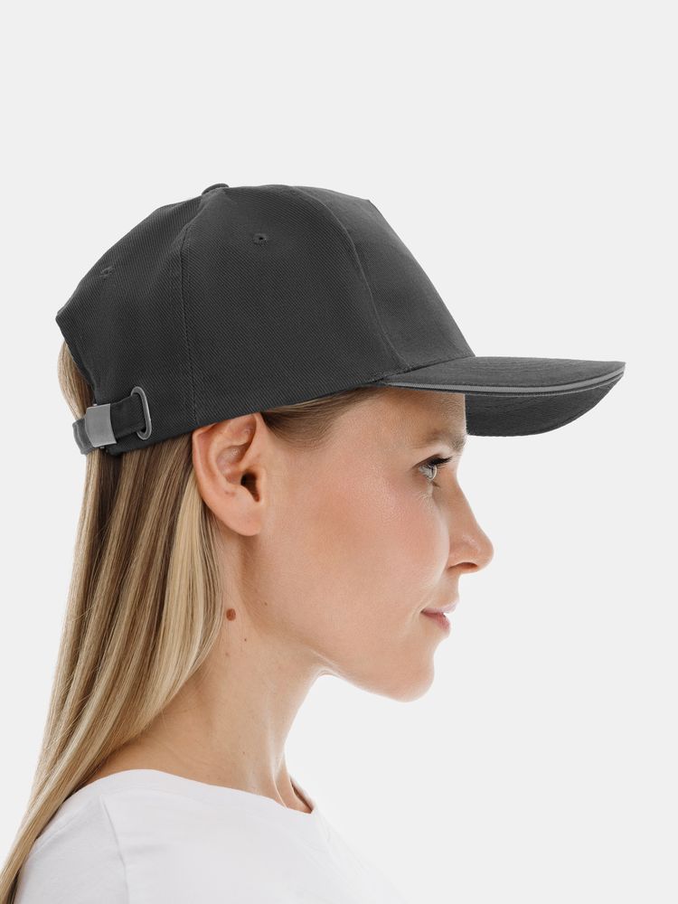 Модель бейсболки с 5-ю клиньями без лобового шва из плотного чесаного хлопка.