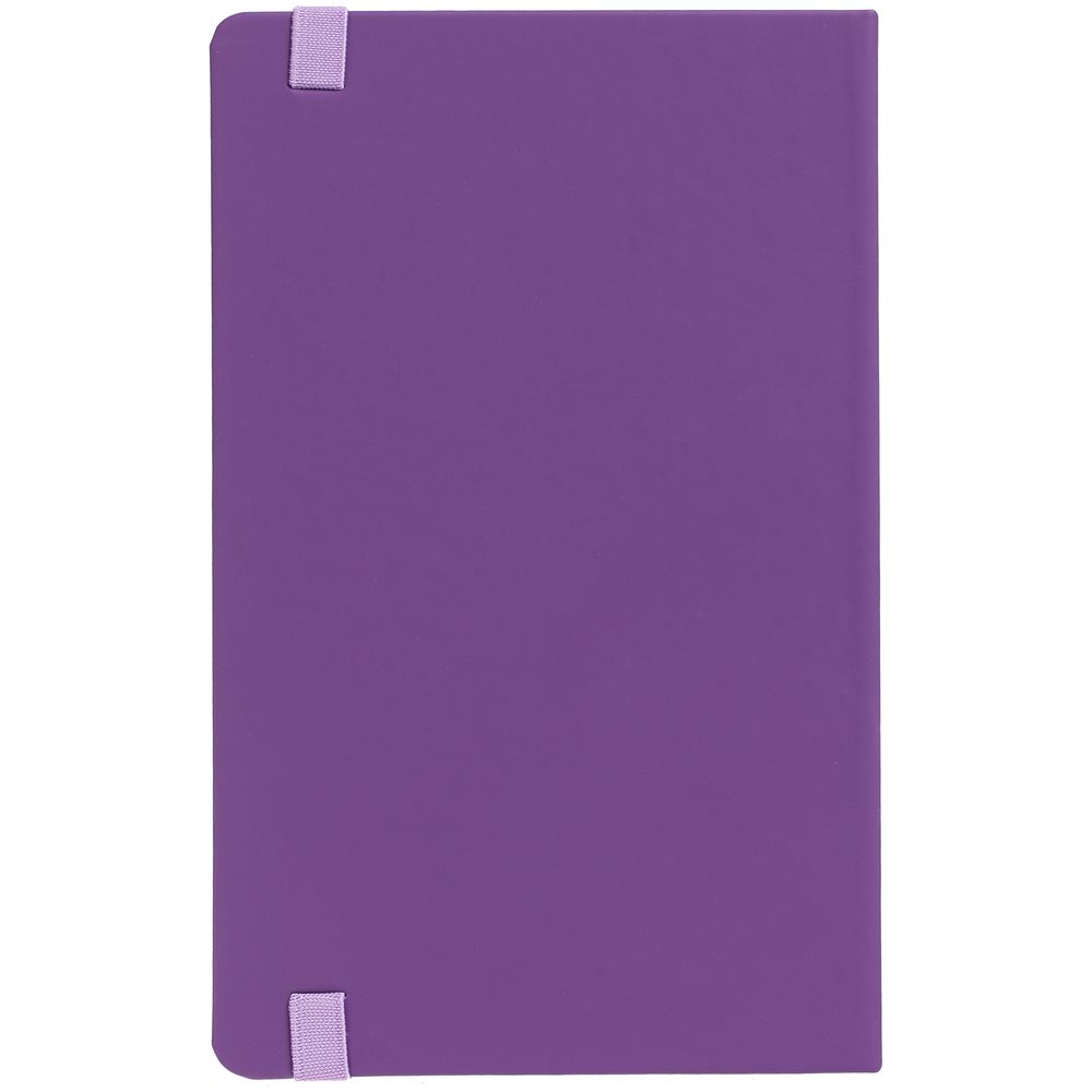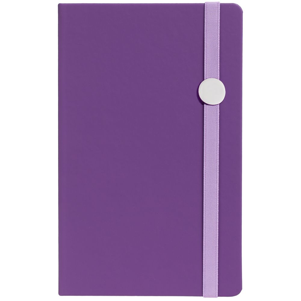 Блокнот в твердой обложке, выполнен из материала Soft Touch, фиолетовый UU, дополнен резинкой и ляссе в цвет обложки.