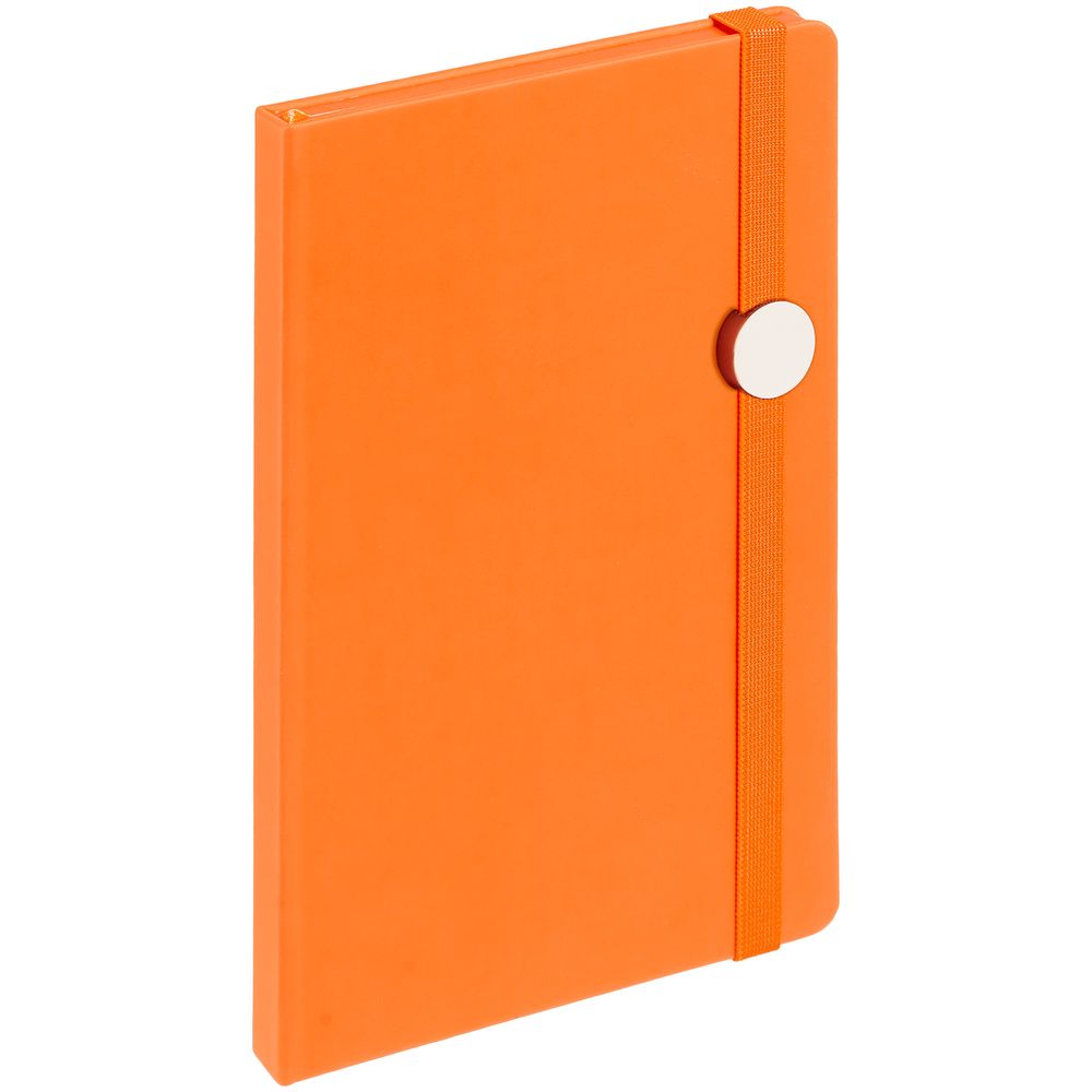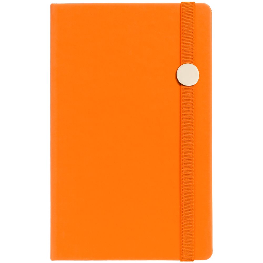 Блокнот в твердой обложке, выполнен из материала Soft Touch, оранжевый ОО, дополнен резинкой и ляссе в цвет обложки.