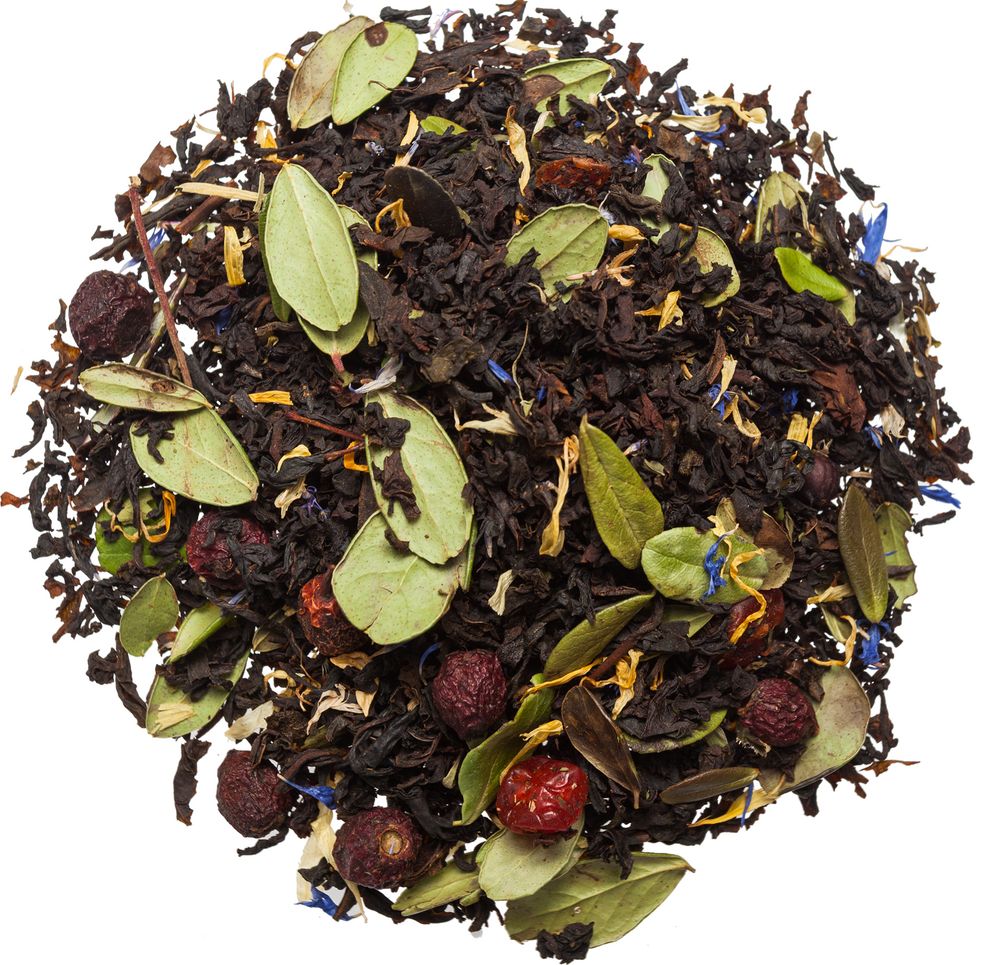 Черный индийский чай, лист брусники, мальва, календула, можжевельник, боярышник, клюква, мята, ароматизирован маслами.