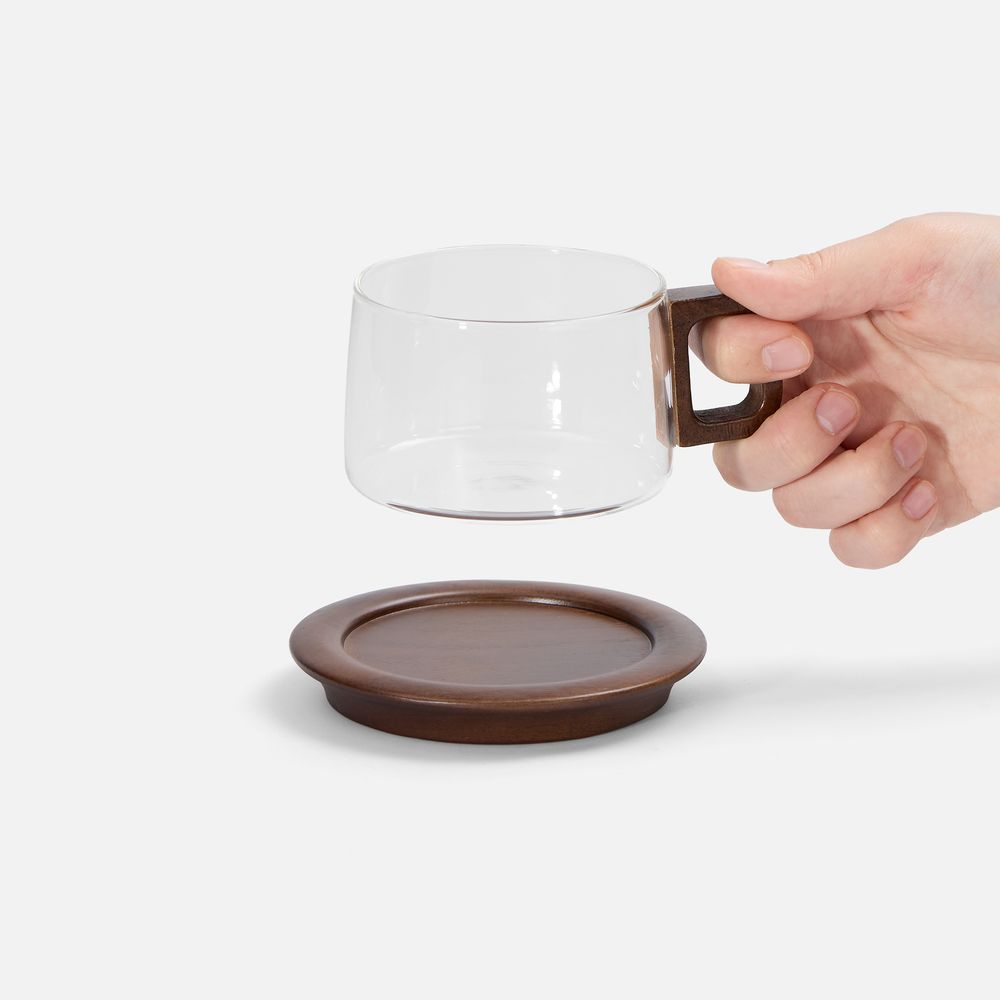 Чайная пара с чашкой из прочного боросиликатного стекла в сочетании с элементами из ореха станет изюминкой домашней или офисной подачи горячих напитков.