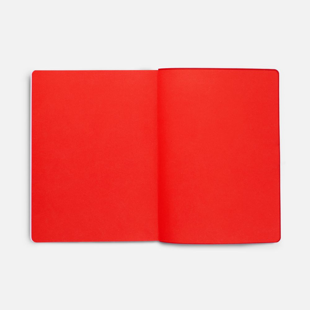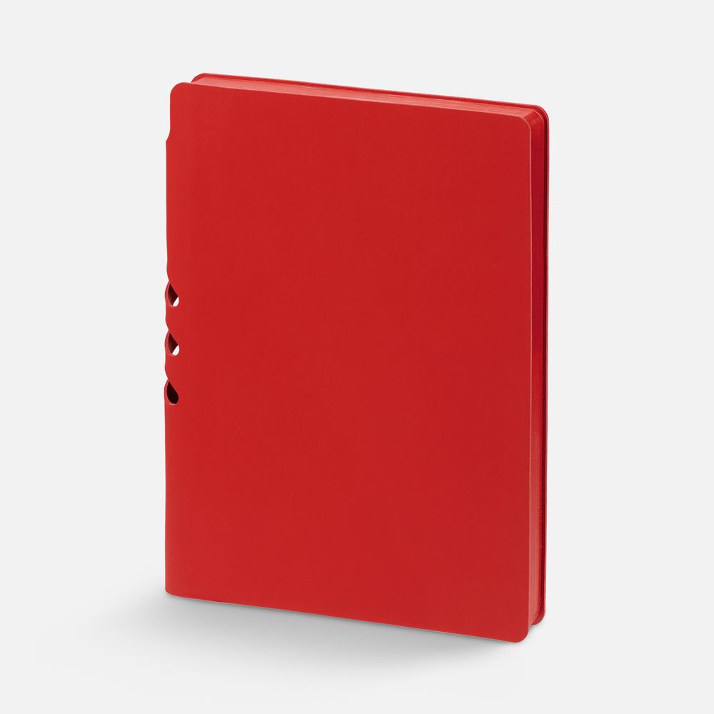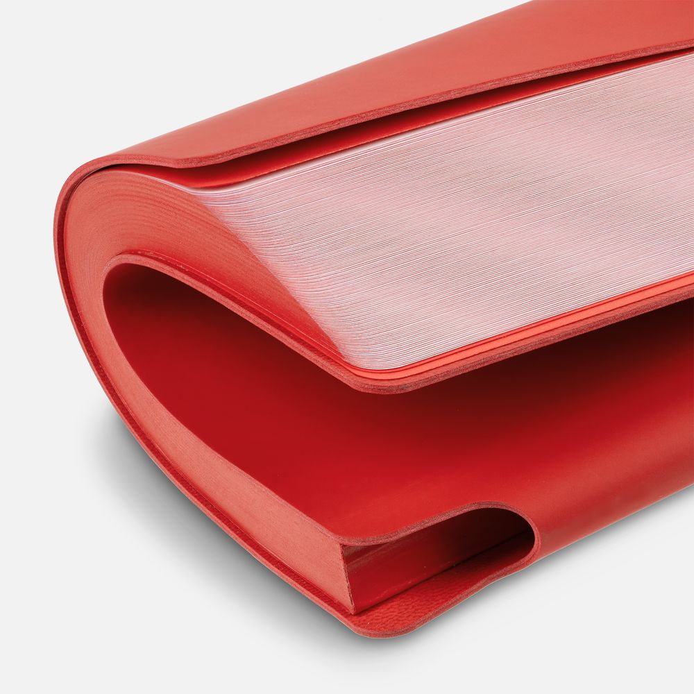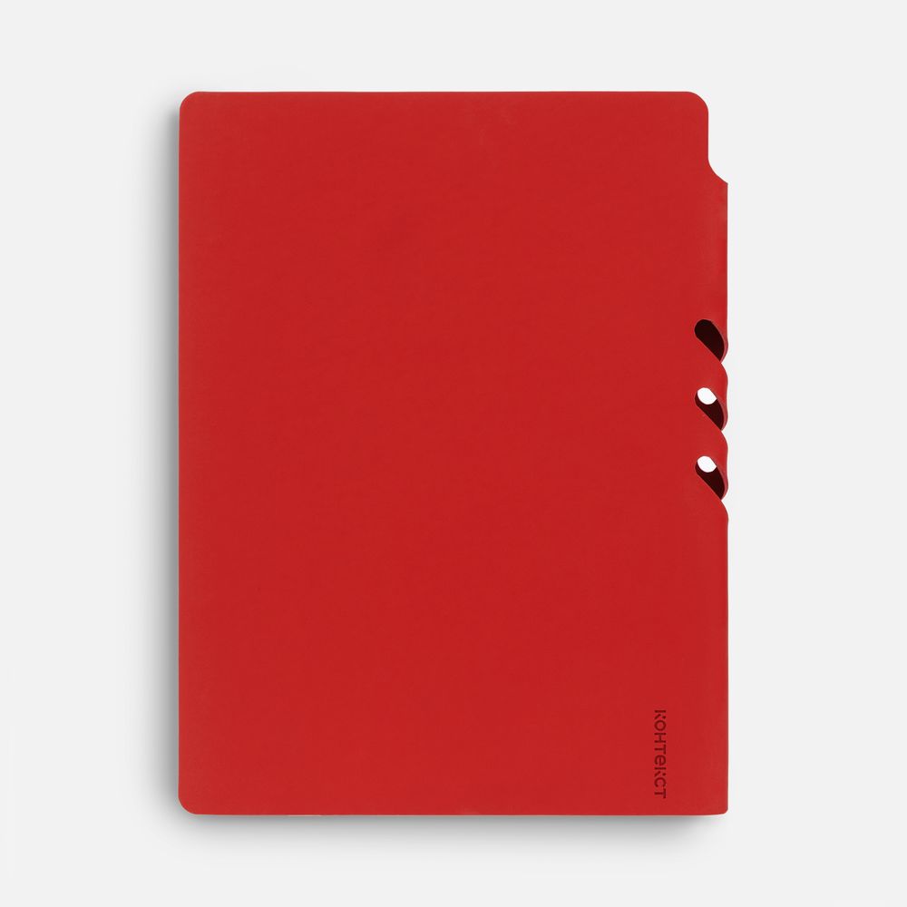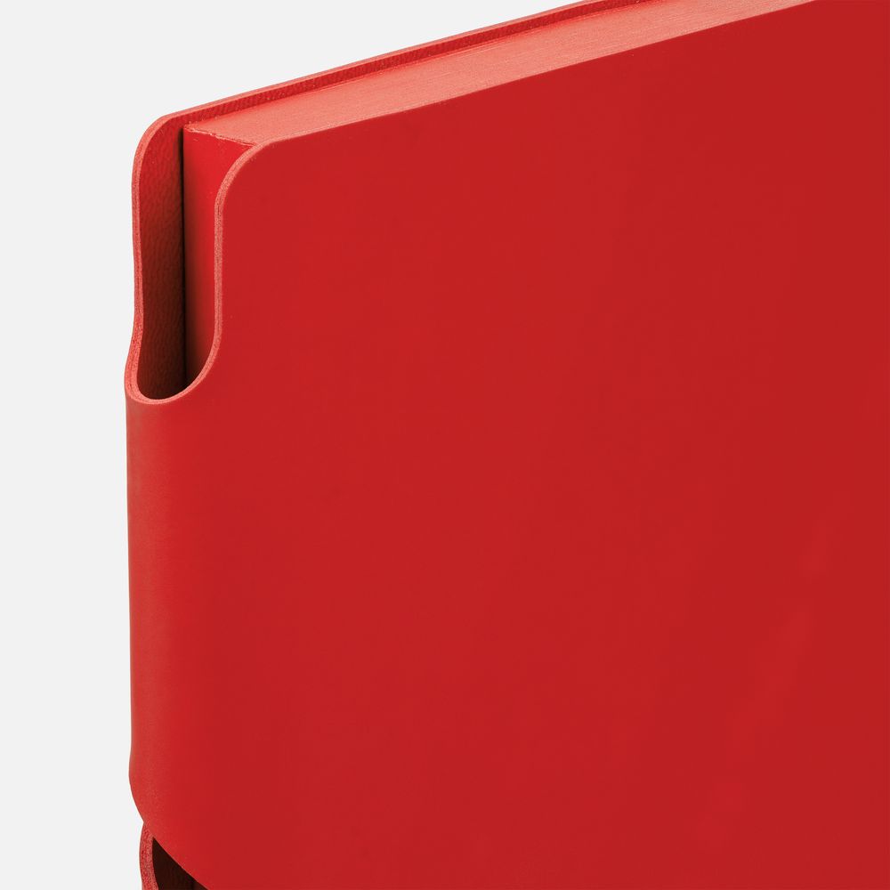 Гибкая обложка выполнена из материала Soft Touch Ultra, красный РР и Latte, красный РР (внутренняя часть обложки). Внутри корешка — специальное место для крепления ручки размером до 15х1 см.