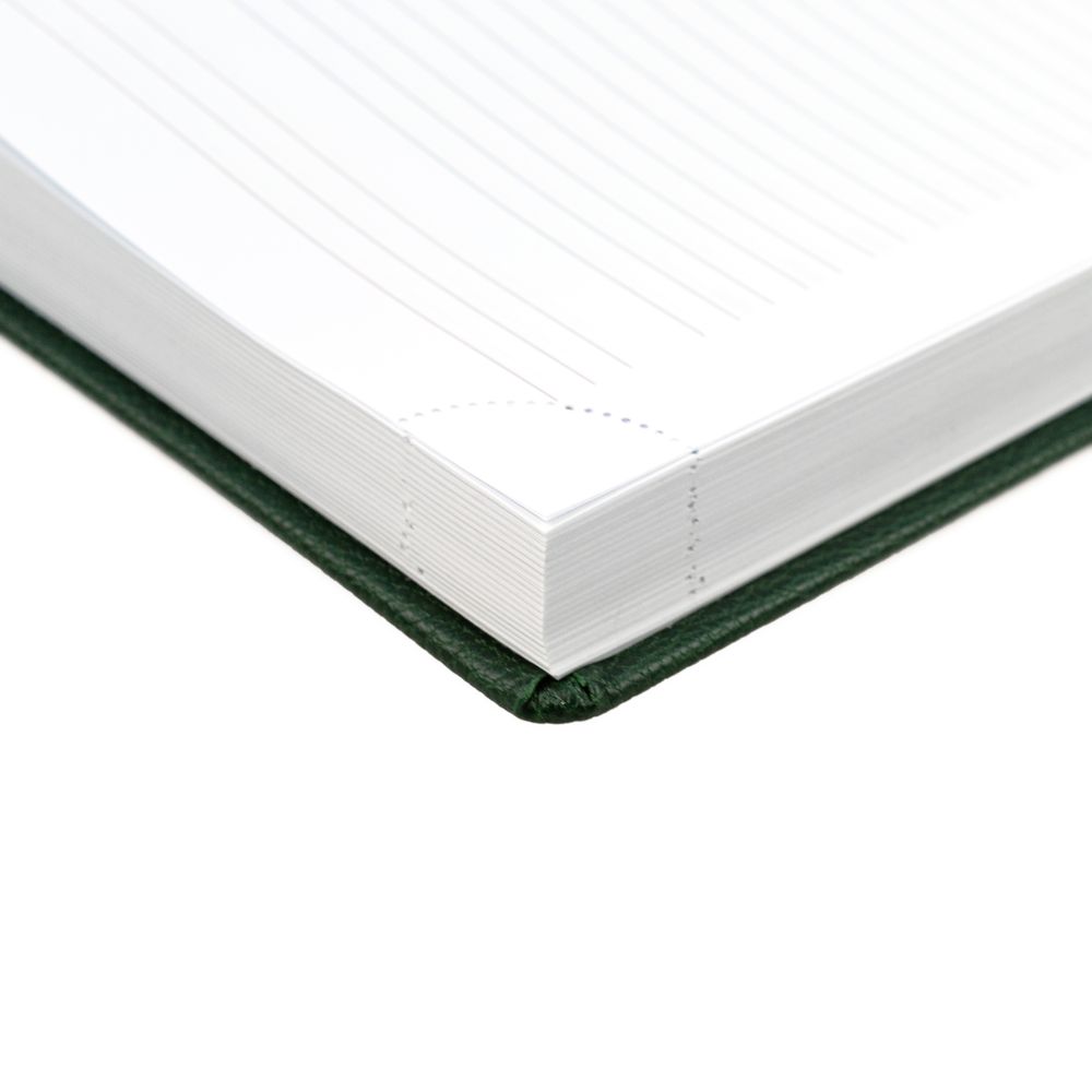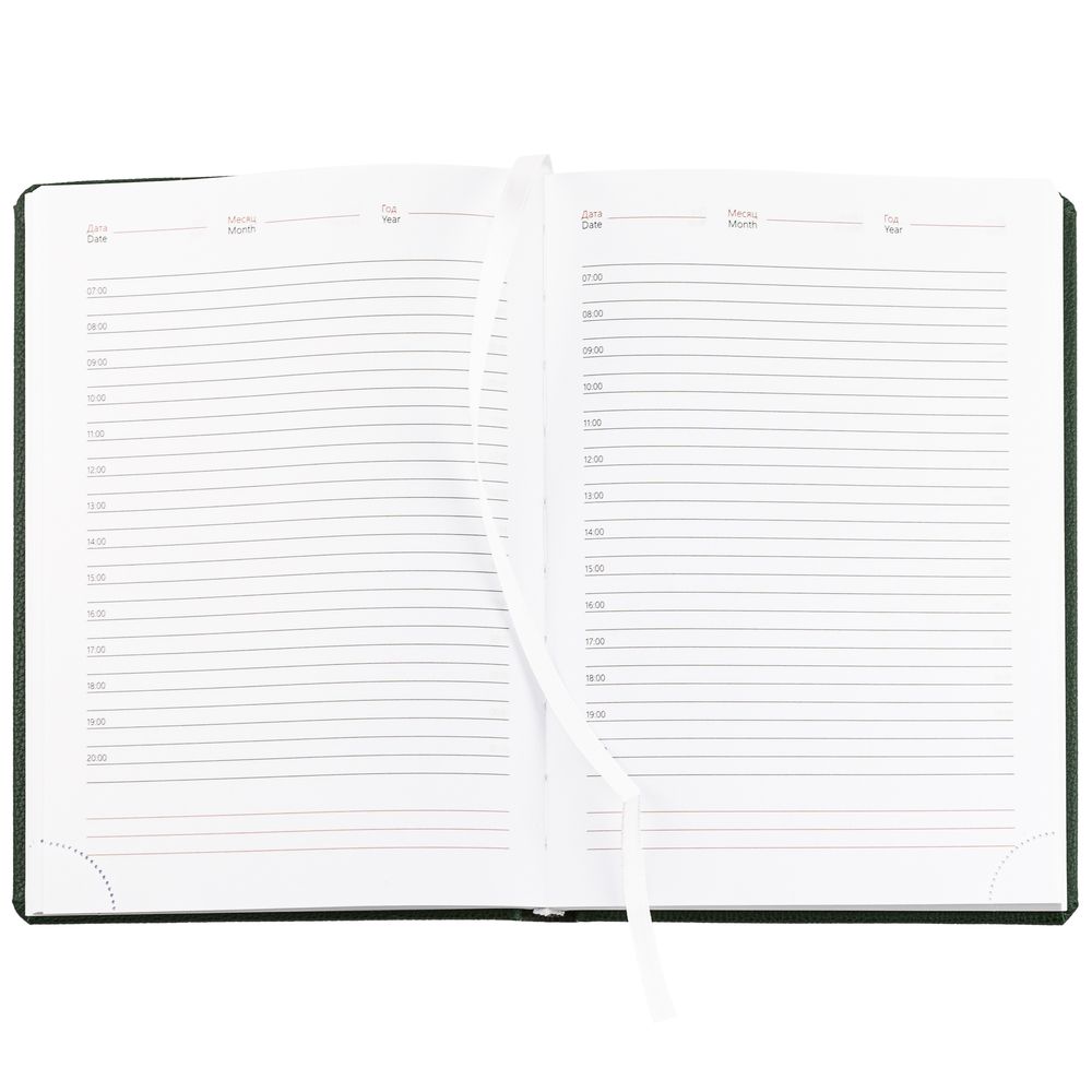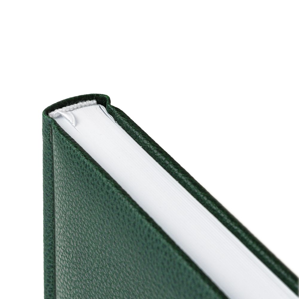 Ежедневник в твердой обложке c поролоном, выполнен из материала La Fite, зеленый FF, дополнен ляссе белого цвета.