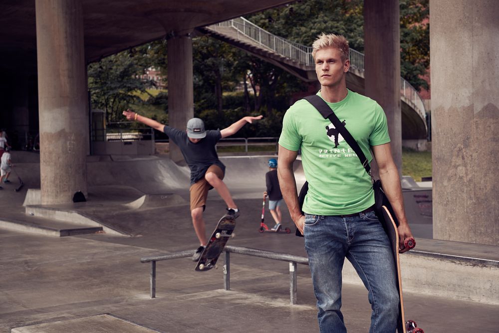Мужская футболка с уплотненными швами на плечах и двойным швом с эластаном. Четырехслойная резинка на воротнике предохраняет его от растяжения.