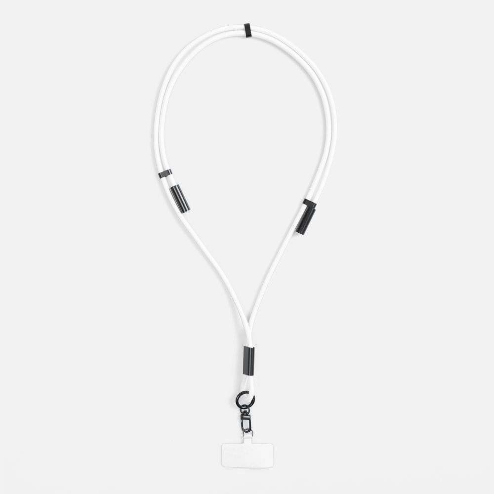 Важно: Для крепления кабеля телефон должен иметь чехол. Если ланьярд распускается под тяжестью смартфона, убедитесь, что среднее из трех колец фурнитуры находится по центру ланьярда (на шее под затылком), а не сбоку. Соседние ветви оплетки должны идти вместе, без зазоров, так достигается трение ткани о ткань.