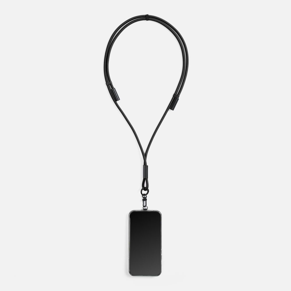 Важно: Для крепления кабеля телефон должен иметь чехол. Если ланьярд распускается под тяжестью смартфона, убедитесь, что среднее из трех колец фурнитуры находится по центру ланьярда (на шее под затылком), а не сбоку. Соседние ветви оплетки должны идти вместе, без зазоров, так достигается трение ткани о ткань.