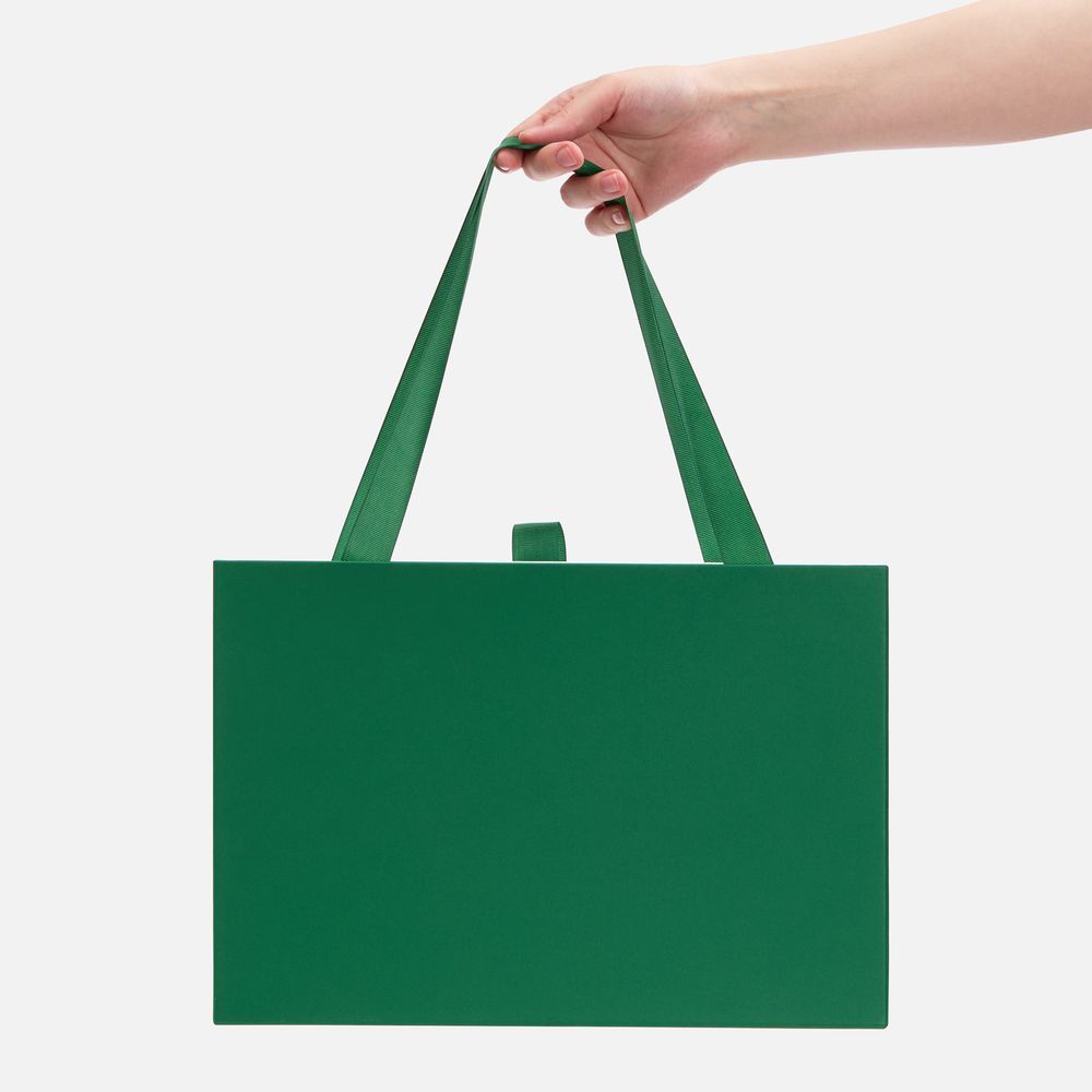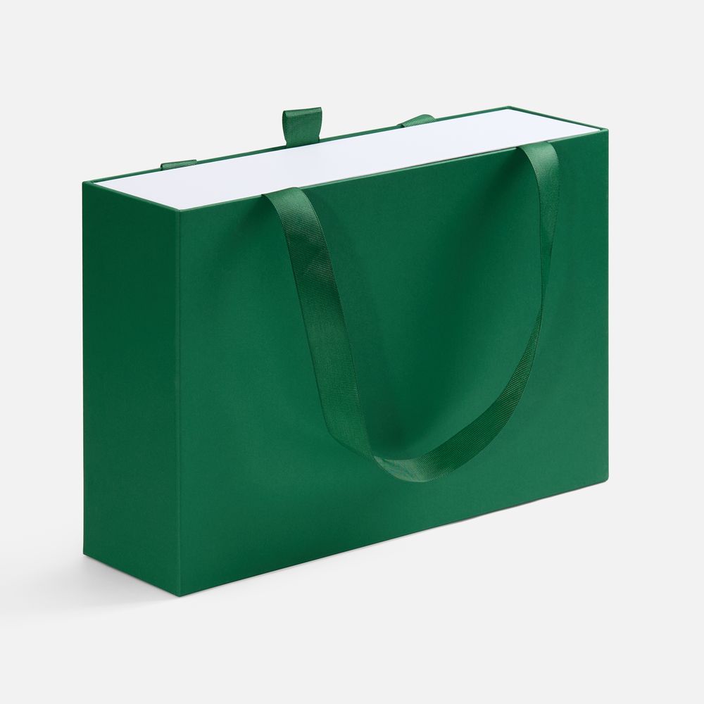 Внешний короб каширован дизайнерской бумаги и оснащен прочными ручками из репсовой ленты. Внутренний короб отделан белой бумагой, ламинированной матовой пленкой.