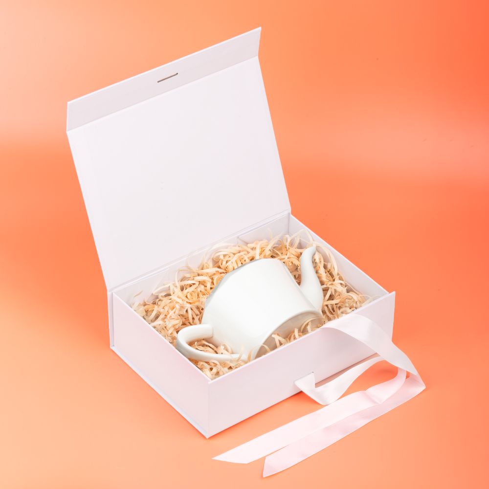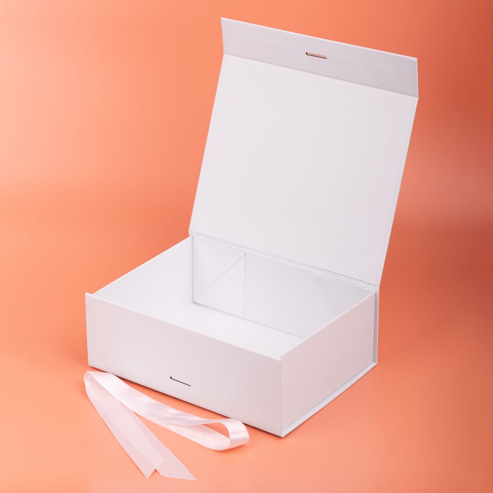 Коробка из переплетного картона, кашированного тонированной в массе крафтовой бумагой. Крышка на двух магнитах дополнительно фиксируется репсовой лентой.Толщина картона 2 мм.