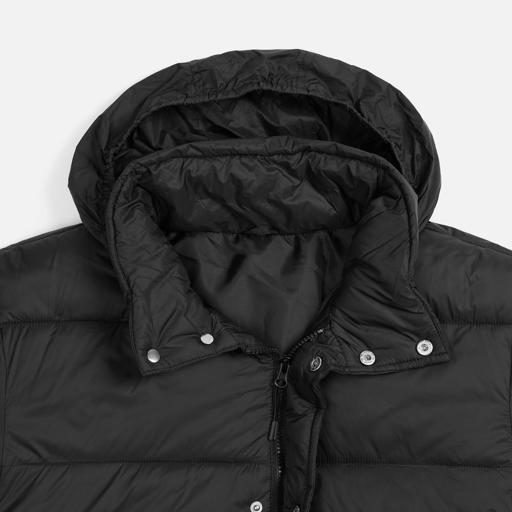 - Капюшон без подкладки убирается в воротник и плотно фиксируется на потайные кнопки