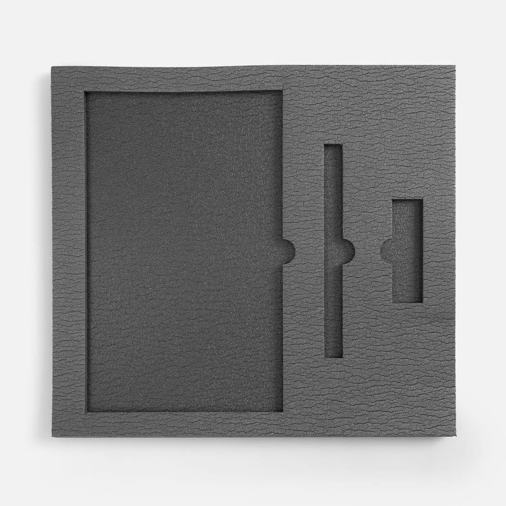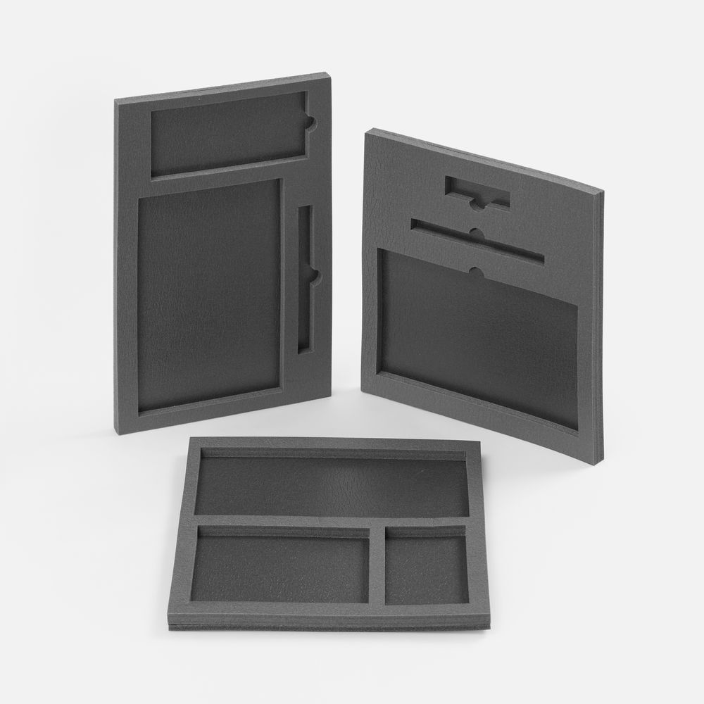 Ложемент, изготовленный из материала Izolon 500 черного цвета, представляет собой многослойную конструкцию, состоящую из нижнего слоя толщиной 5 мм и верхнего слоя толщиной 10 мм. В соответствии с утвержденным макетом, проемы для размещения предметов могут быть спроектированы как в одном, так и в обоих слоях.