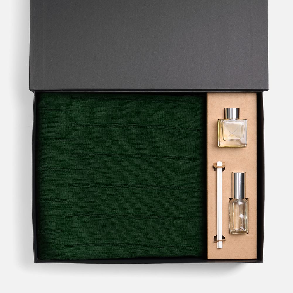 плед — акрил 100%, плотность 310 г/м² ; флакон — стекло, палочки из файбера; коробка — переплетный картон, бумага Magic |