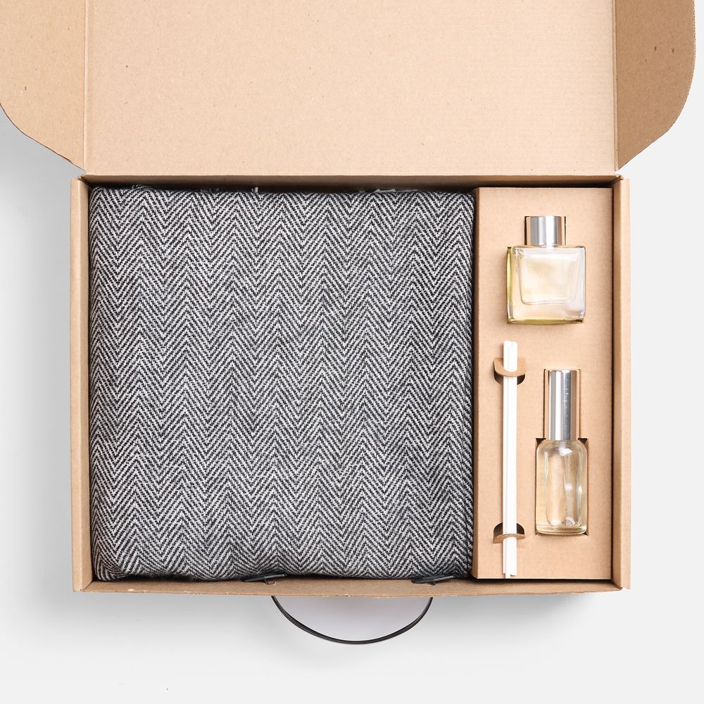 флакон — стекло, палочки из файбера; плед — шерсть, 15%; хлопок, 5%; полиэстер, 60%; акрил, 20%, плотность 200 г/м²; коробка — картон |