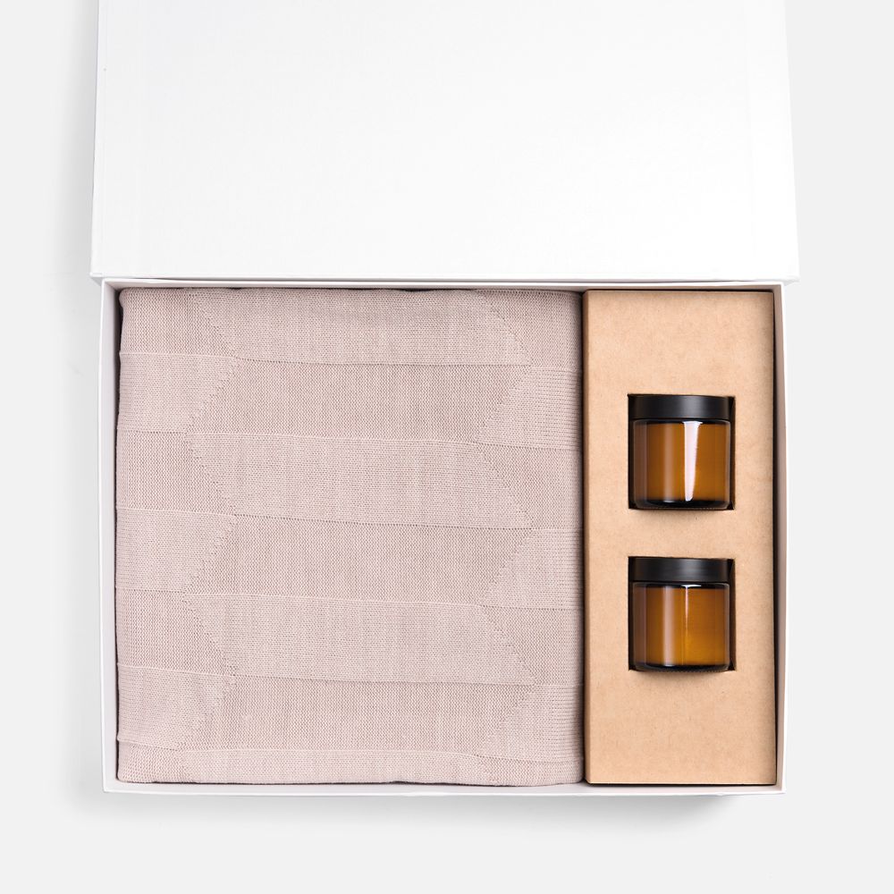 плед — акрил 100%, плотность 286 г/м²; подсвечник — стекло, крышка — пластик; свеча — парафин, соевый воск, парфюмерная композиция; коробка — переплетный картон, бумага Majestic |
