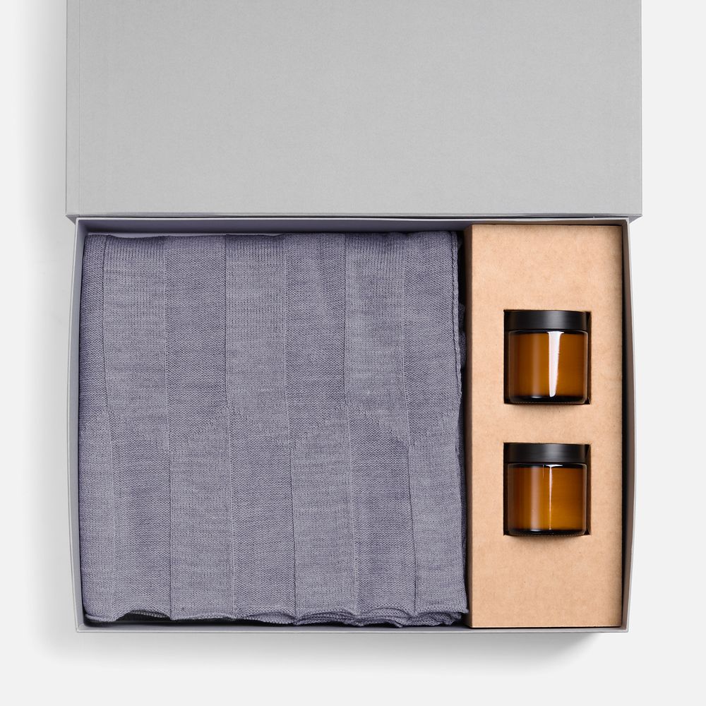 плед — акрил 100%, плотность 286 г/м²; подсвечник — стекло, крышка — пластик; свеча — парафин, соевый воск, парфюмерная композиция; коробка — переплетный картон, бумага Malmero |