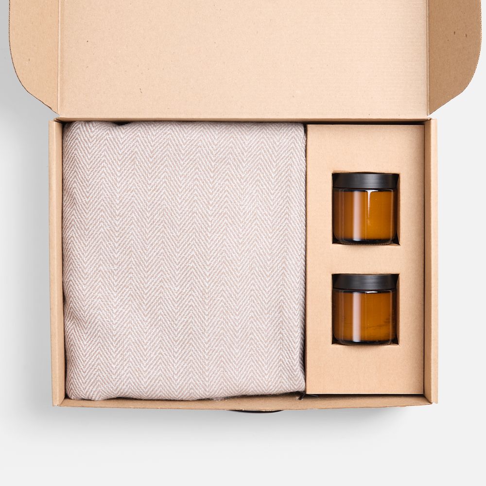 плед — шерсть, 15%; хлопок, 5%; полиэстер, 60%; акрил, 20%, плотность 200 г/м²; подсвечник — стекло, крышка — пластик; свеча — парафин, соевый воск, парфюмерная композиция; коробка — микрогофрокартон, Т-23Е |