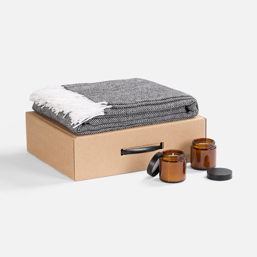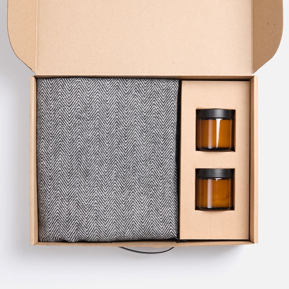 плед — шерсть, 15 %; хлопок, 5 %; полиэстер, 60 %; акрил, 20%, плотность 200 г/м²; подсвечник — стекло, крышка — пластик; свеча — парафин, соевый воск, парфюмерная композиция; коробка — микрогофрокартон, Т-23Е |