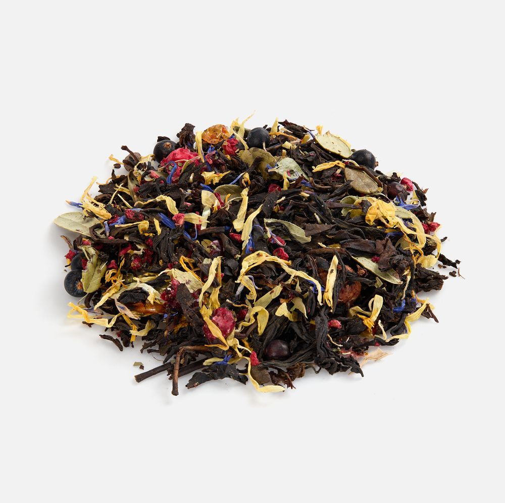 Состав: чай черный индийский листовой, ягоды брусники сублимированные, ягоды облепихи сублимированные, кусочки малины сублимированные, плоды можжевельника, мелисса, лепестки календулы, лепестки василька, листья брусники, боярышник, аромат лесных ягод