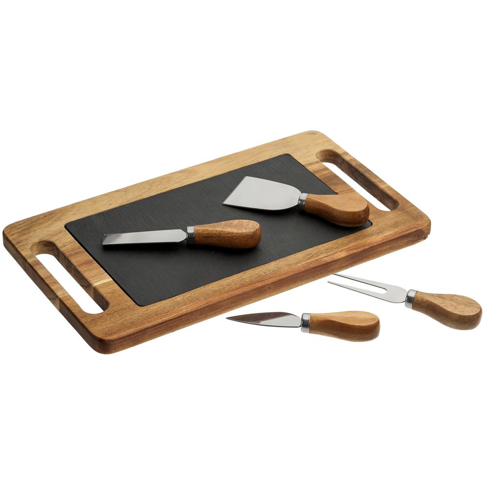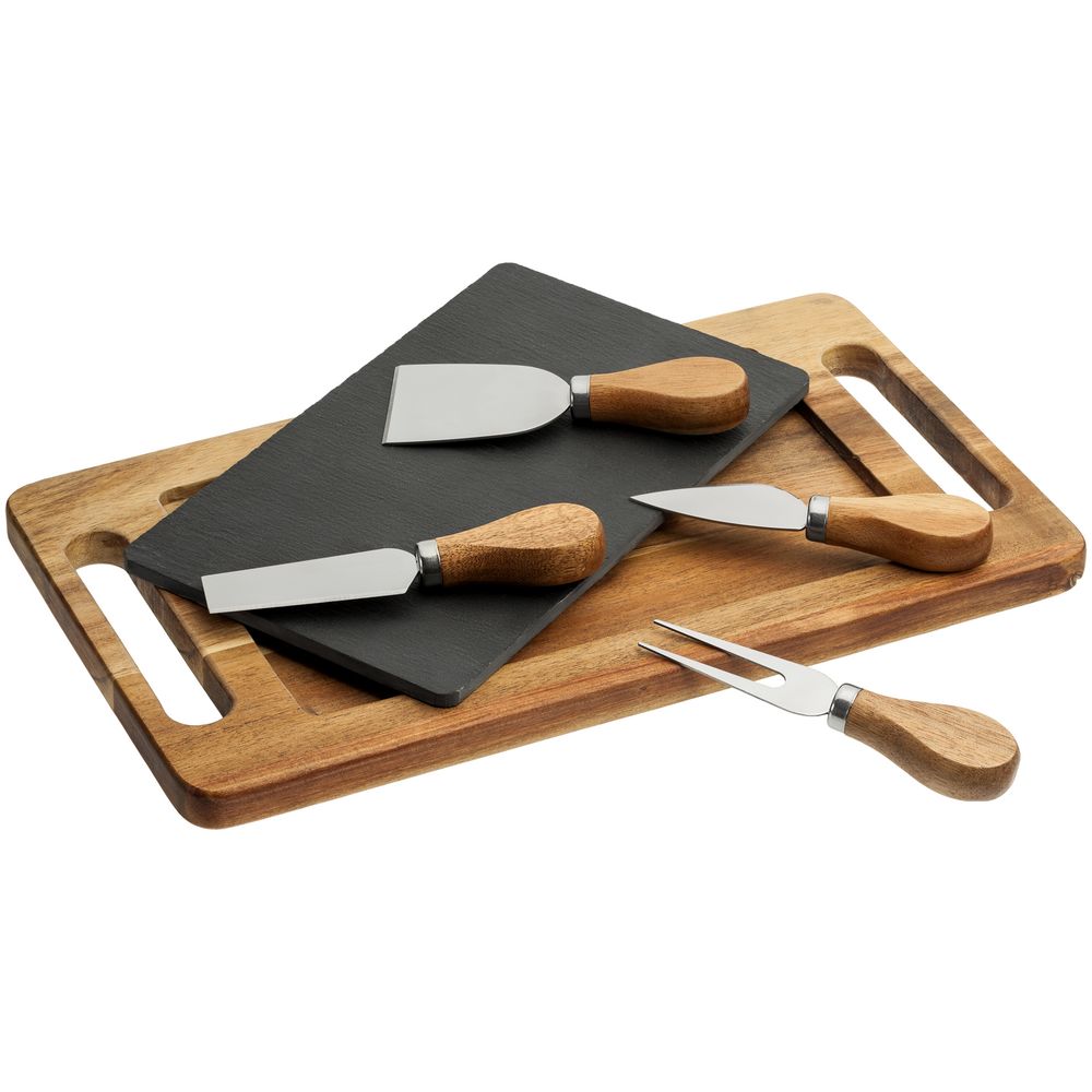 Поднос и рукоятки ножей выполнены из дерева акации, лезвия — из высококачественной нержавеющей стали.