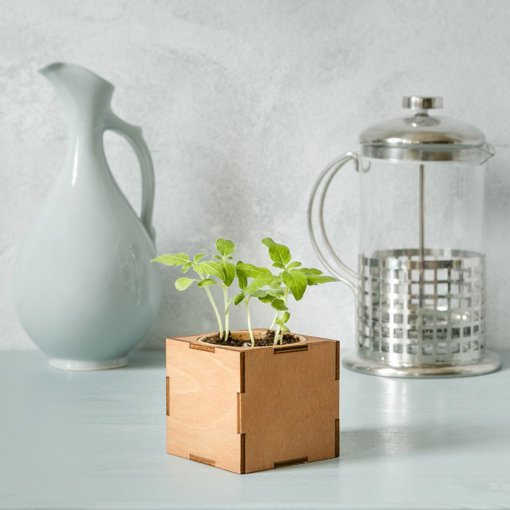 В наборе: деревянный куб, бумажный стаканчик, питательный грунт, семена, вермикулит.