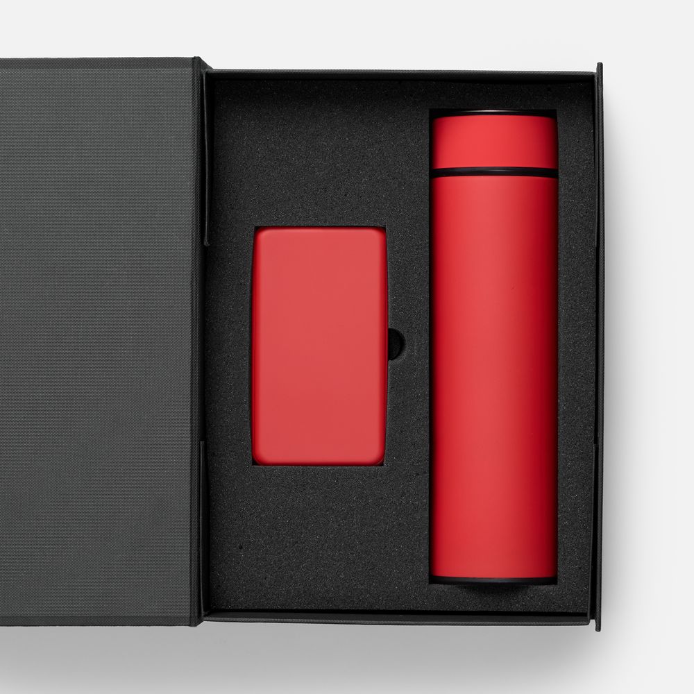 аккумулятор — пластик; покрытие софт-тач; термос — нержавеющая сталь, 304; покрытие софт-тач; коробка — переплетный картон |