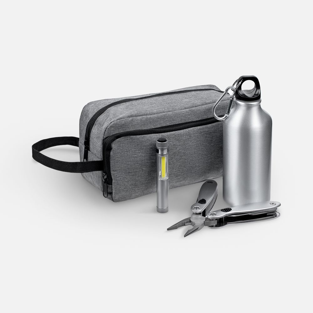 мультитул, фонарик, бутылка — алюминий; несессер — полиэстер |