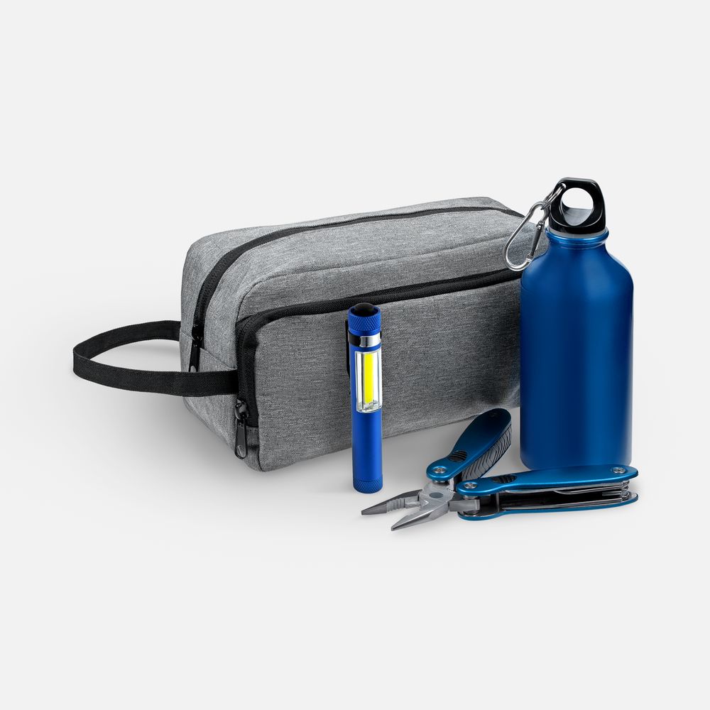 мультитул, фонарик, бутылка — алюминий; несессер — полиэстер |
