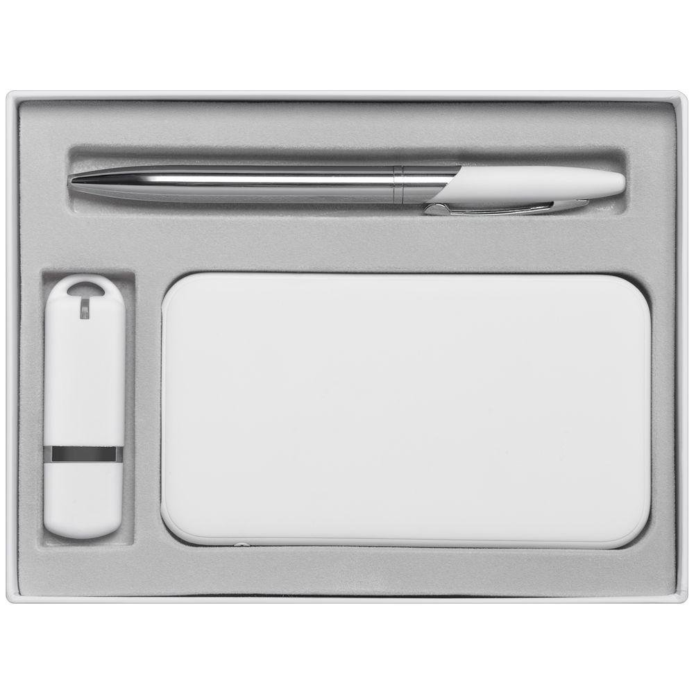 флешка и аккумулятор — пластик, покрытие софт-тач; ручка — металл, покрытие софт-тач; переплетный картон |