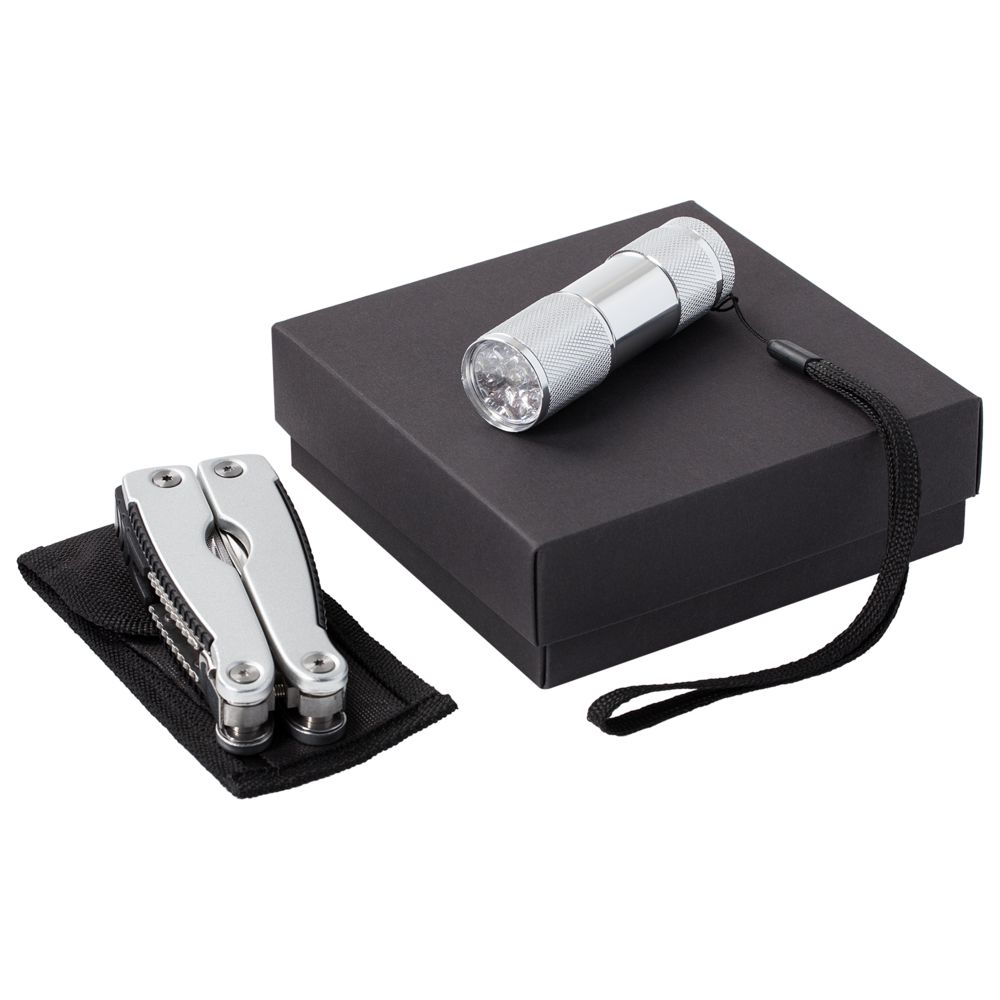 фонарик — алюминий; мультитул: инструменты — нержавеющая сталь; рукоятки — алюминий; чехол — полиэстер; коробка — картон |