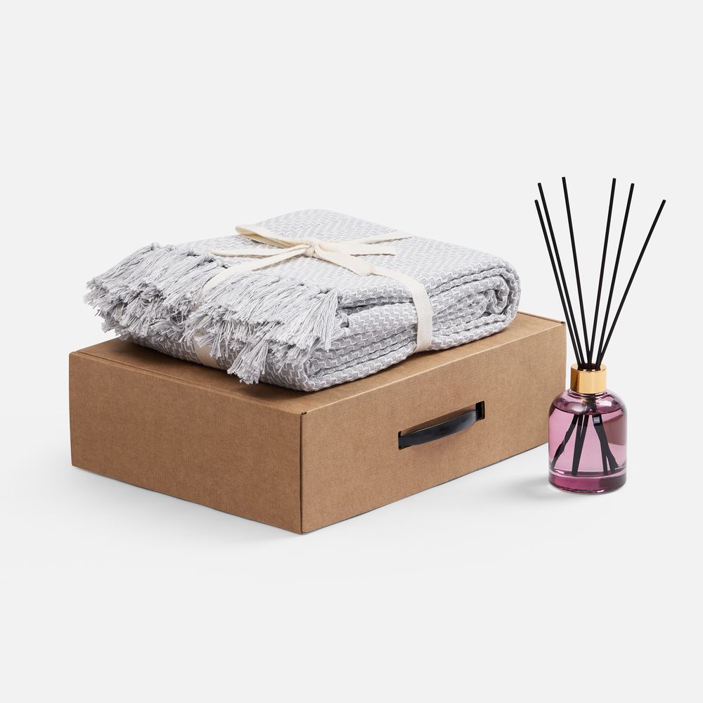 плед — хлопок 80%, полиэстер 20%, плотность 260 г/м²; флакон — стекло, палочки из файбера; коробка — микрогофрокартон |