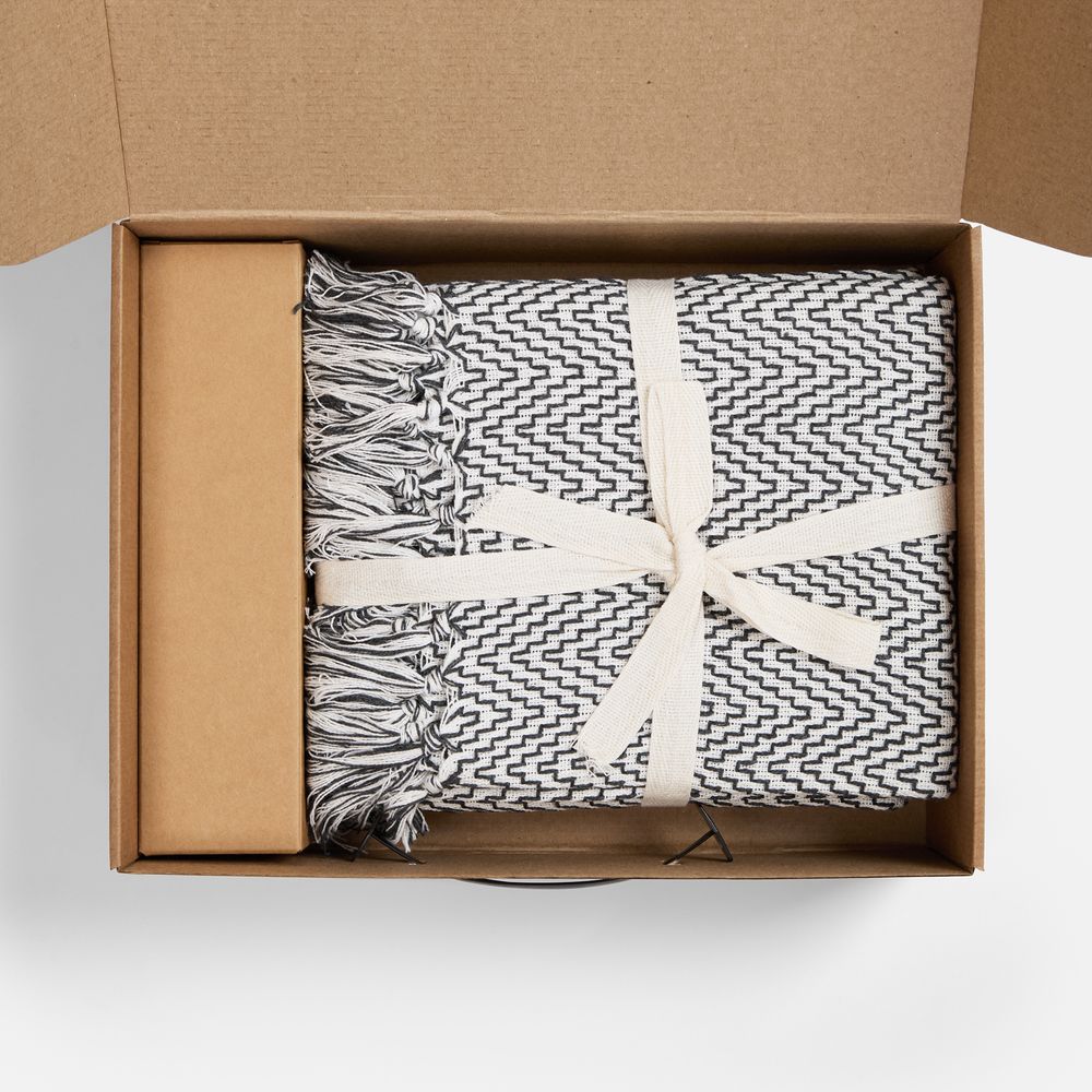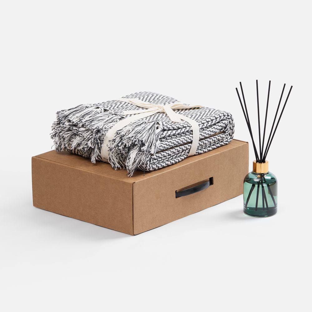 плед — хлопок 80%, полиэстер 20%, плотность 260 г/м²; флакон — стекло, палочки из файбера; коробка — микрогофрокартон |