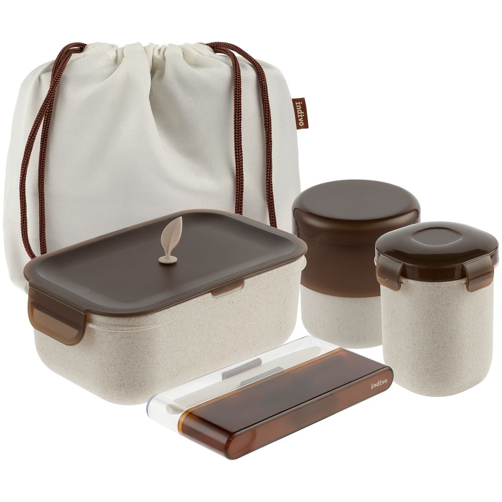 ланчбоксы, приборы — растительные волокна; мешок — пластик, полиэстер; пластик, полипропилен |
