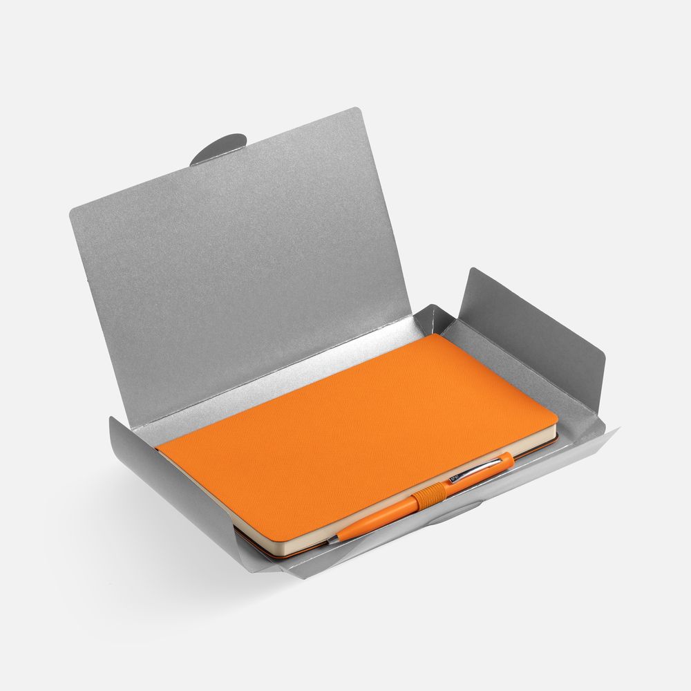 Зауженный ежедневник и ручка комплементарного оттенка в простой лаконичной коробке — готовое предложение делового подарка для сотрудников и партнеров.