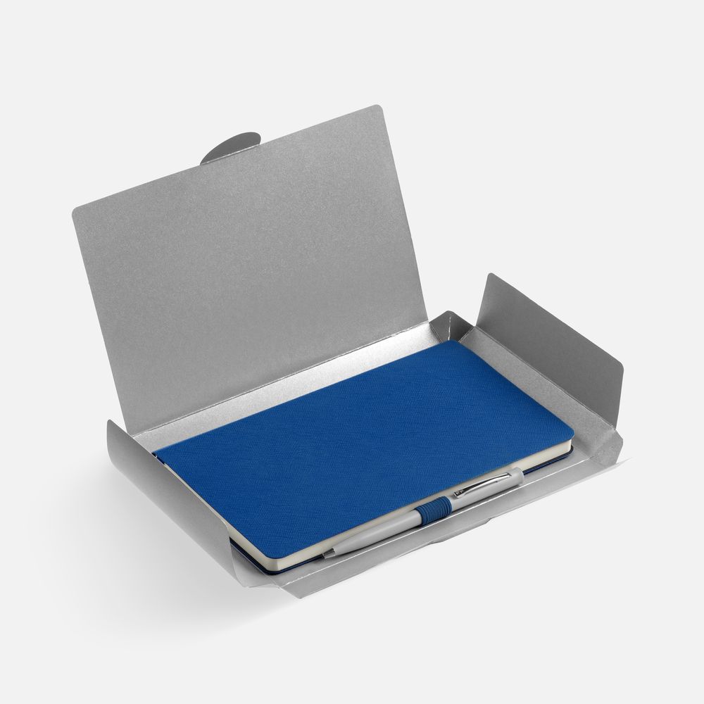 Зауженный ежедневник и ручка комплементарного оттенка в простой лаконичной коробке — готовое предложение делового подарка для сотрудников и партнеров.
