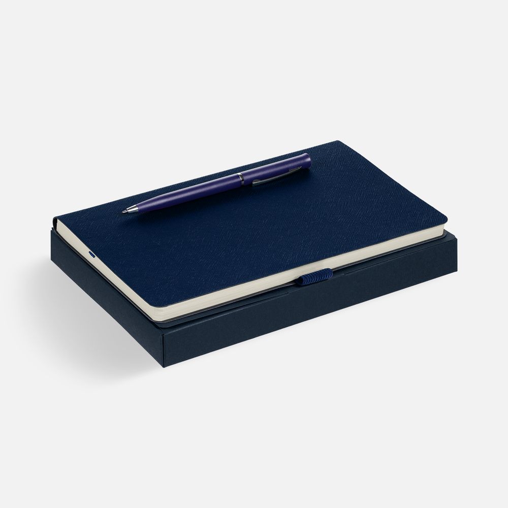 Зауженный ежедневник и ручка комплементарного оттенка в простой лаконичной коробке — готовое предложение делового подарка для сотрудников и партнеров.