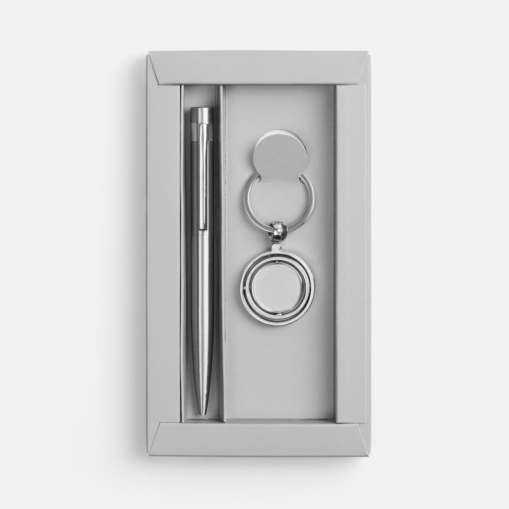 ручка — сталь, переработанная; брелок — металл; коробка — картон |