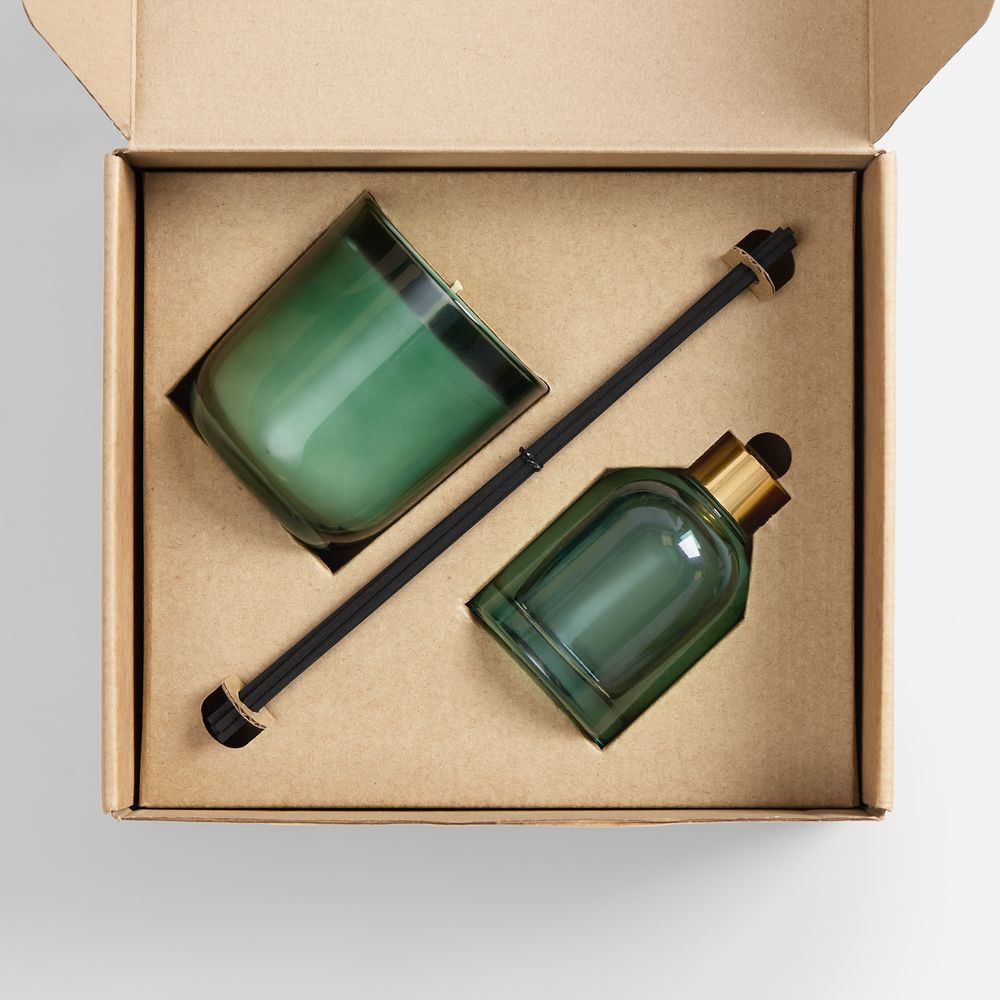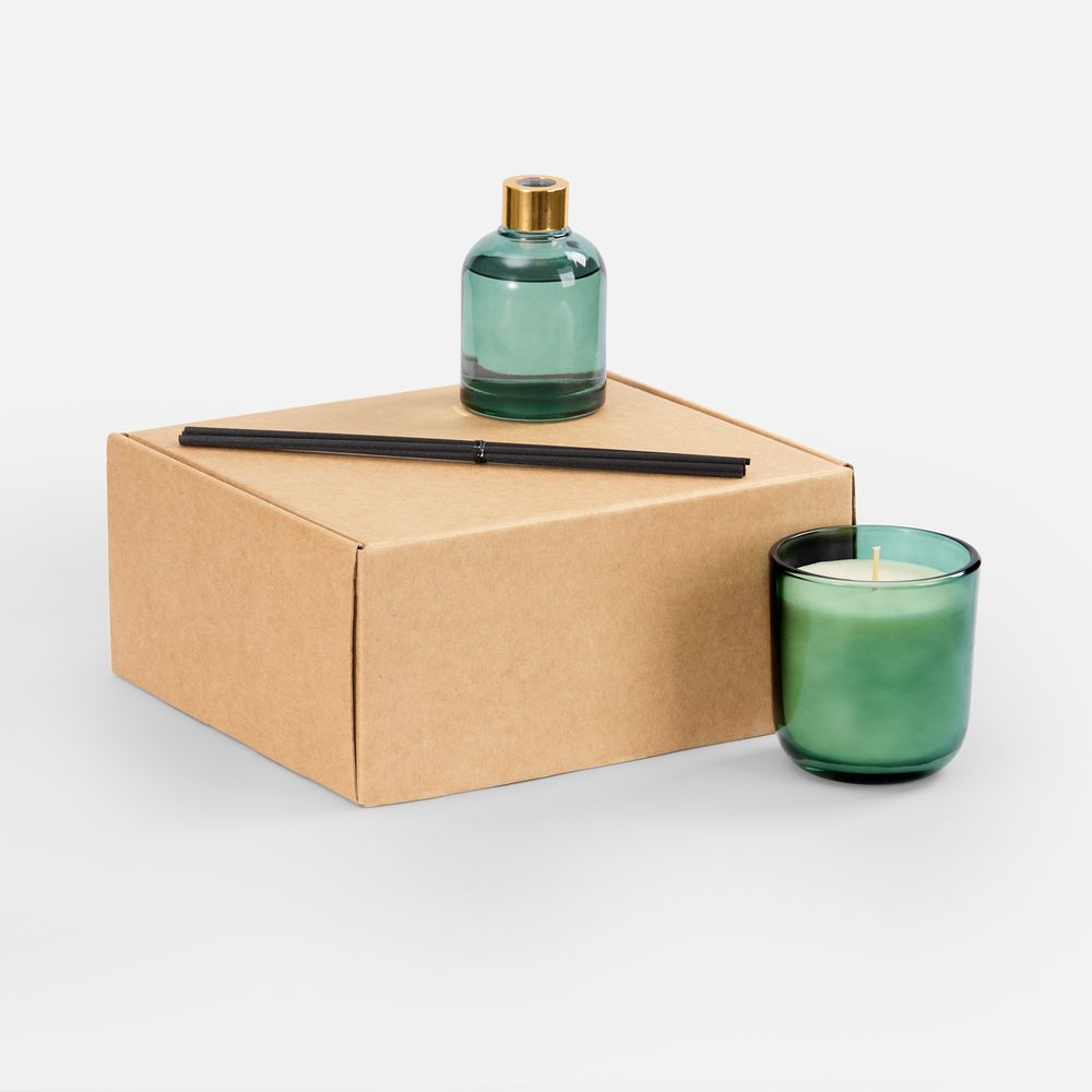 флакон, подсвечник — стекло, палочки из файбера; свеча — воск; коробка — микрогофрокартон, плотность 385 г/м² |