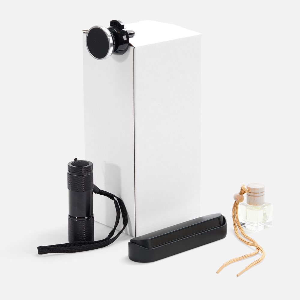 держатель — АБС-пластик; визитка — пластик; фонарик — алюминий; ароматизатор — стекло, дерево; коробка — микрогофрокартон |