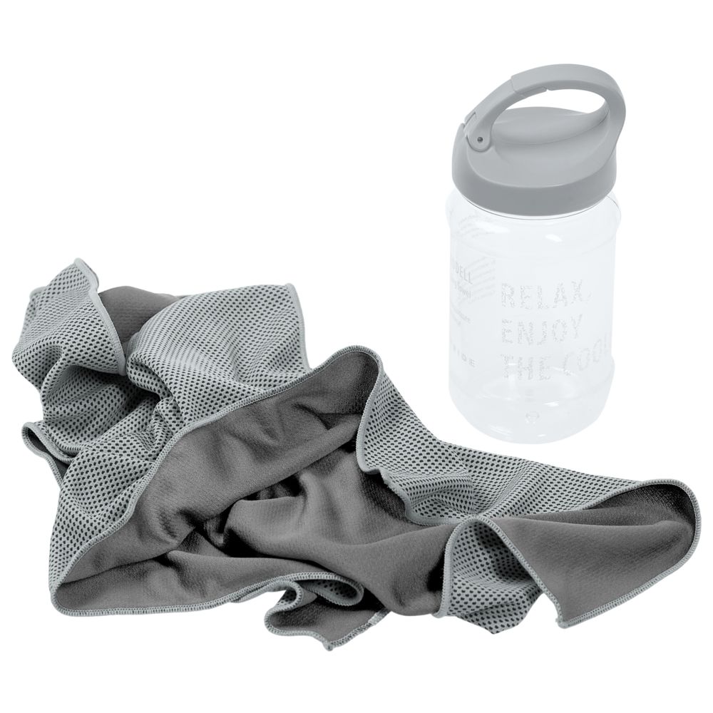 бутылка — пластик; полотенце — полиэстер, 45%, нейлон 55%, плотность 160 г/м² |