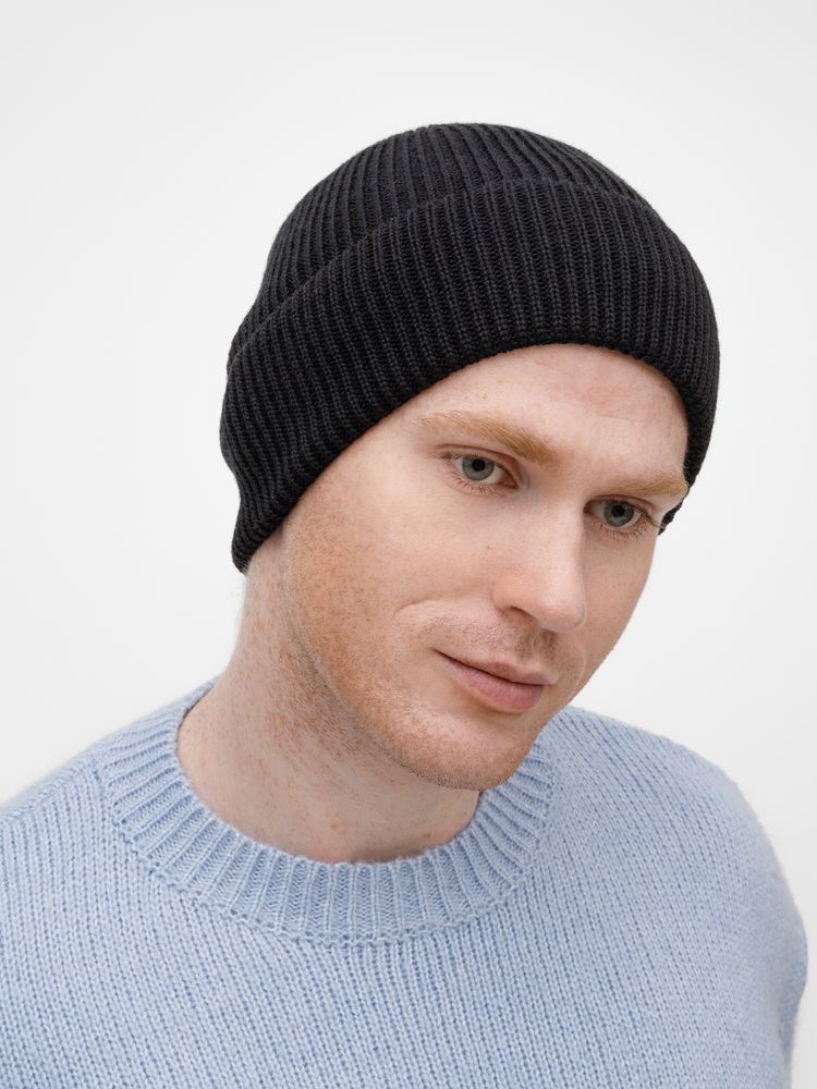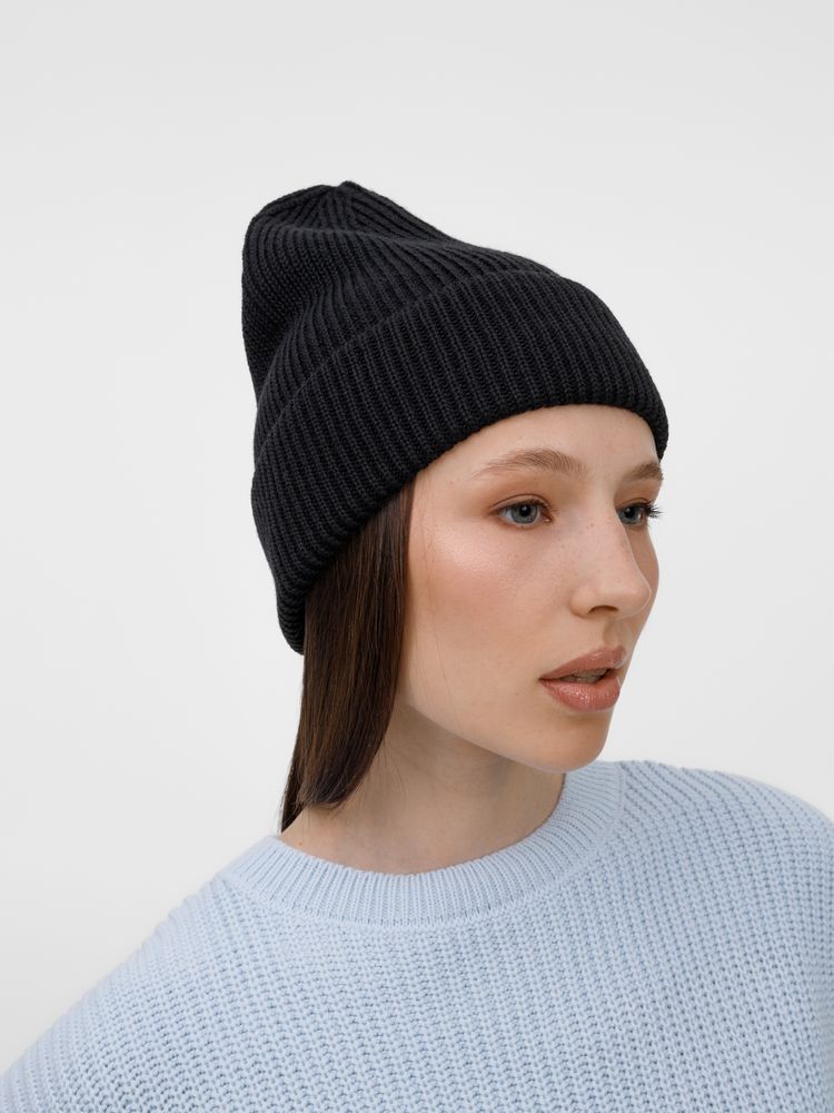 Удлиненный силуэт шапки Nobilis Mono из мягкой полушерстяной пряжи с широким отворотом создает стильный современный образ, а фактурная вязка добавляет объем и выразительность.