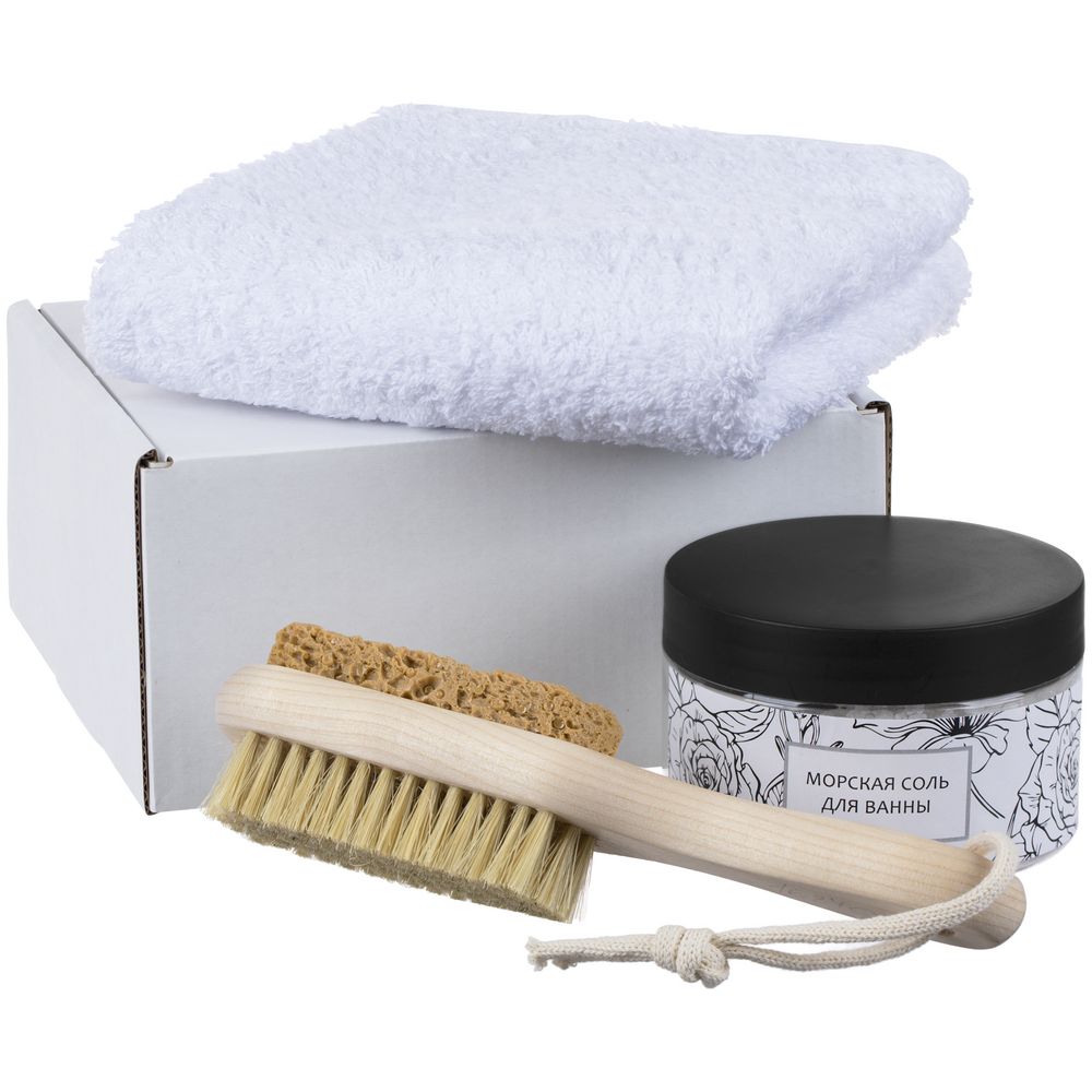 коробка: 17,5х15,2х8,2 см; полотенце: 30х60 см; щетка: 3,5х4,5х18 см; соль: диаметр 9 см, высота 5,7 см |