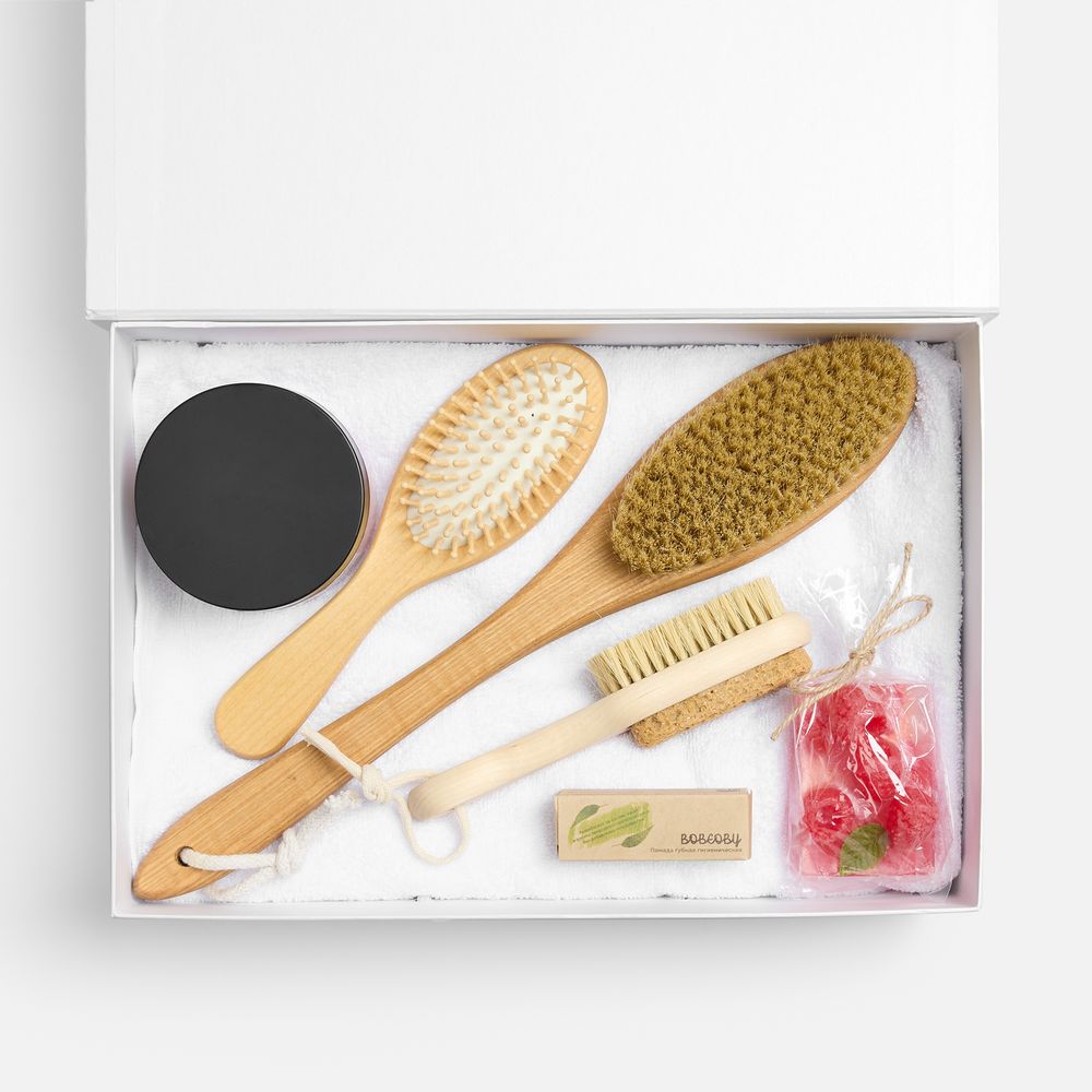 полотенце — хлопок 100%; щетки и расческа — дерево; коробка — переплетный картон |
