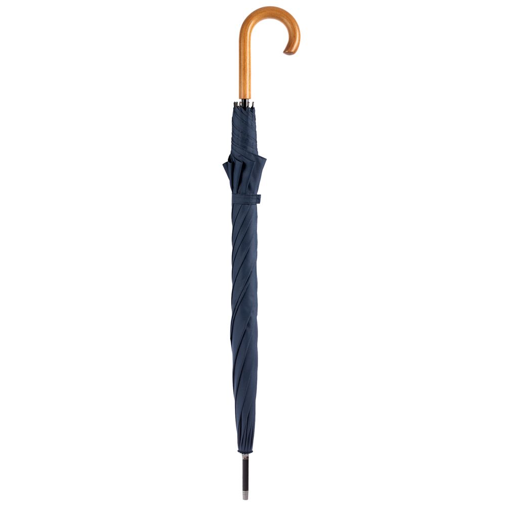 Элегантный зонт с большим куполом и деревянной J-образной ручкой.